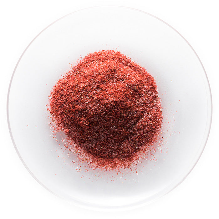 Ručne miešaný cukor s mletými mrazom sušenými jahodami s príjemnou jahodovou vôňou. Má prirodzenú, červeno ružovú farbu a vynikajúcu chuť skutočného ovocia. V porovnaní s čerstvými jahodami cukor nie je kyslastý, ale skôr sladký a lahodne ovocný s delikátne jahodovou chuťou. Mleté jahody sa v tekutine rehydratujú a jemne pokrm zahustia.